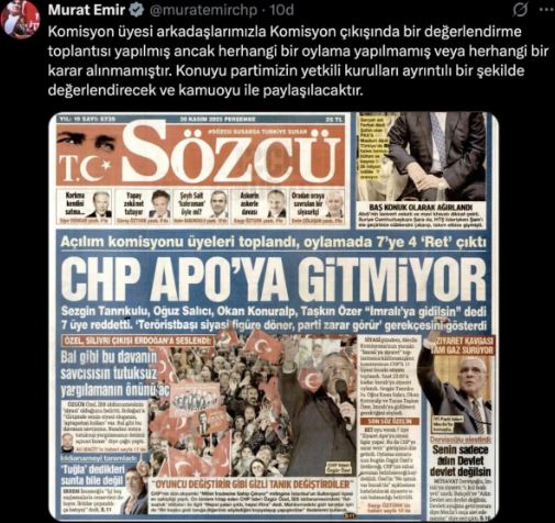 Sözcü gazetesinin, Terörsüz Türkiye Komisyonu’nun İmralı’ya gidip gitmeyeceğine dair CHP’de oylama yapıldığı ve 7’ye 4 “ret” çıktığı yönündeki haberi, CHP Grup Başkanvekili Murat Emir tarafından yalanlandı.