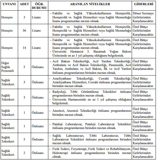 Sözleşmeli Personel çalıştırılmasına ilişkin olarak 28 Haziran 2007 tarihli ve 26566 sayılı Resmi Gazete'de yayımlanan esaslar ve 5620 sayılı Kanun ve 06.06.1978 tarih ve 7/15754 sayılı Bakanlar Kurulu Kararı ile yürürlüğe konulan Sözleşmeli Personel Çalıştırılmasına İlişkin Esaslar ile ek ve değişikliklerine göre 657 sayılı Devlet Memurları Kanunu'nun 4. maddesinin (B) fıkrasına göre Üniversitemiz Sağlık Araştırma ve Uygulama Hastanesi Başhekimliğinde istihdam edilmek üzere, 2016 KPSS(B) grubu puan sırası esas alınmak suretiyle aşağıda belirtilen pozisyonlara sözleşmeli personel alınacaktır.