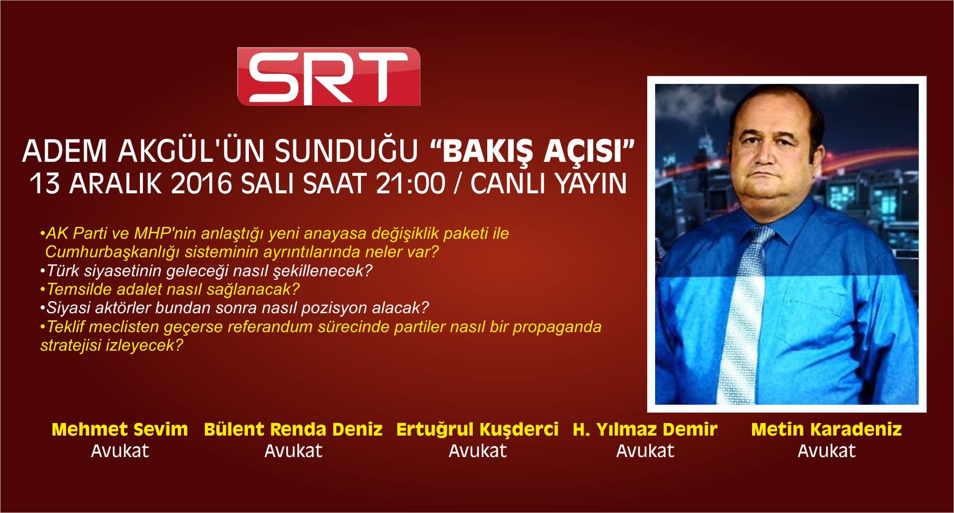 Her hafta Salı günleri saat 21:00'de Srt'de Adem Akgül'ün sunduğu "Bakış Açısı" programı konukları ile gündemdeki en önemli gelişmeleri, tüm yönleriyle masaya yatırıyor.