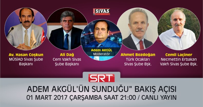 Bakış Açısı’nda Adem Akgül’ün bu haftaki konukları,Türk ocakları Sivas şube başkanı Prof.Dr. Ahmet Bozdoğan, cem vakfı Sivas şube başkanı Ali Dağ, MÜSİAD Sivas şube başkanı Av. Mustafa Coşkun, Necmettin Erbakan vakfı Sivas şube başkanı Cemil Laçiner olacak.