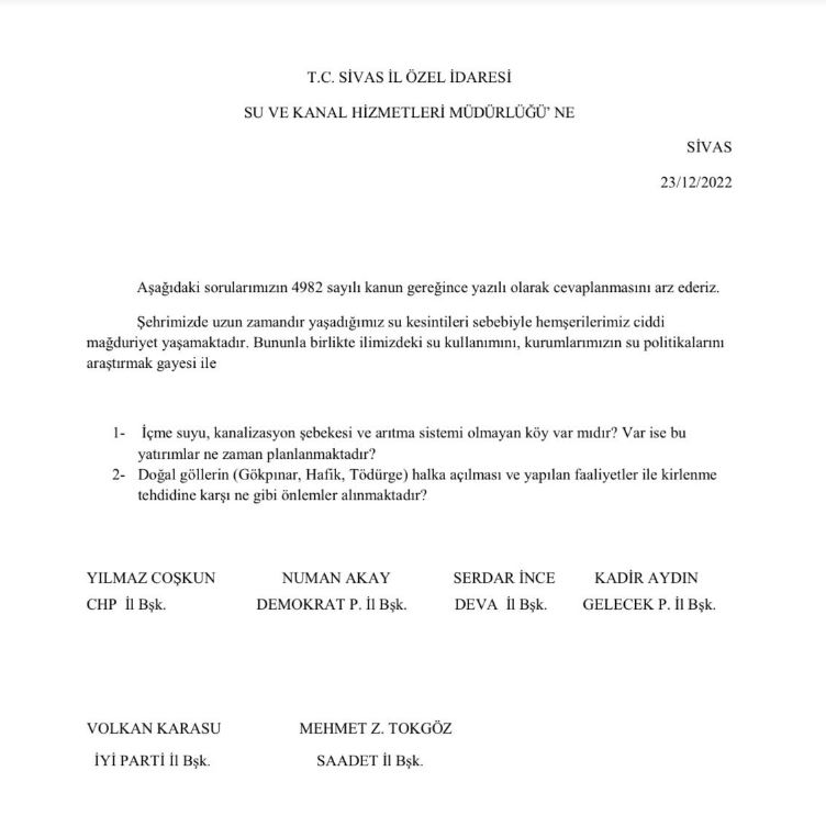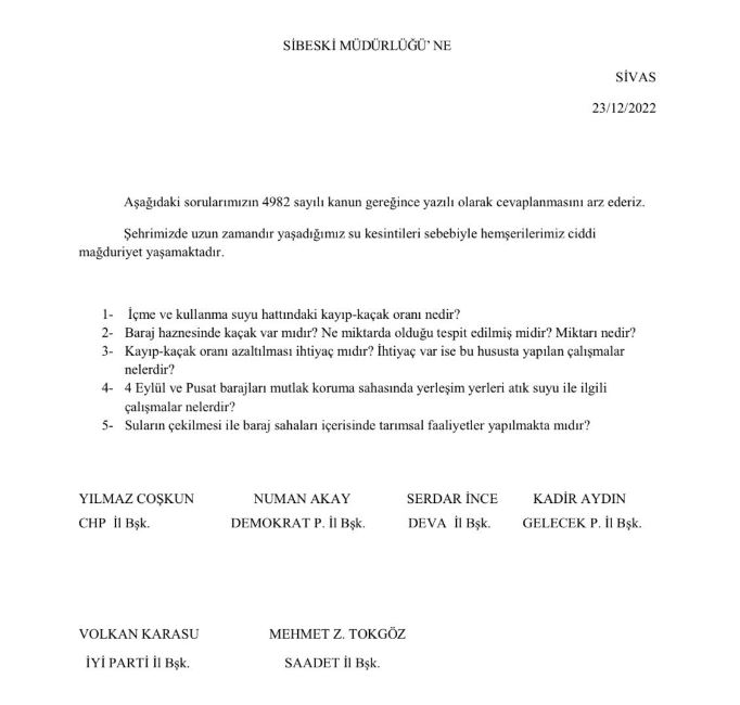 Sivas'ta yaşanan su sorunu nedeniyle Millet İttifakı İl Başkanları ilgili kurumlara dilekçe verme kararı aldı.