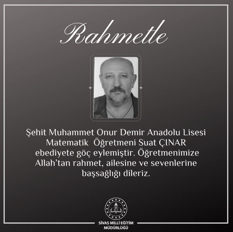 Sivas Belediye Başkanı Hilmi Bilgin, kalp krizi sonucu vefat eden Şehit Muhammed Onur Demir Anadolu Lisesi Matematik Öğretmeni Suat Çınar'ın Ayyıldız Cami’nde kılınan cenaze namazına katıldı.