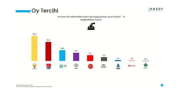 CHP'nin oyları yüzde 25.5 çıkarken, İYİ Parti'nin oyları yüzde 14.6 oldu. HDP yüzde 11.1, MHP yüzde 7.7 çıktı.