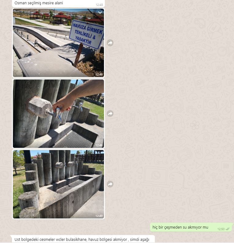 Gönderilen bu mesaj mesire alanlarıyla alakalı. Vatandaş "Osman seçilmiş mesire alani. Ust bolgedeki cesmeler wcler bulasikhane, havuz bölgesi akmiyor , simdi aşağı bolgeye indim ordaki cesmeler akiyor" derken Osman Seçilmiş mesire alanında üst kısımdaki çeşmelerin akmadığını belirtiyor.