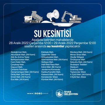 Sivas Belediyesi yaptığı açıklamada: ” 28.12.2022 Çarşamba 12:00’da başlayıp 29.12.2022 Perşembe günü Saat 12:00 saatleri arasında su kesintisi yapılacaktır.” ifadelerine yer verildi.