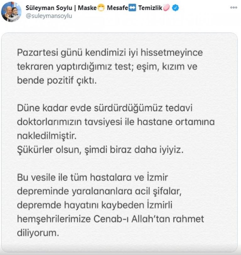 Test sonucunun pozitif çıkmasının ardından evde tedavi altına alındıklarını ve doktor tavsiyesi ile bugün hastaneye kaldırıldıklarını söyleyen Soylu, "Şükürler olsun şimdi biraz daha iyiyiz" ifadelerini kullandı.