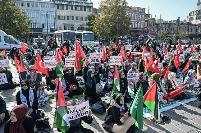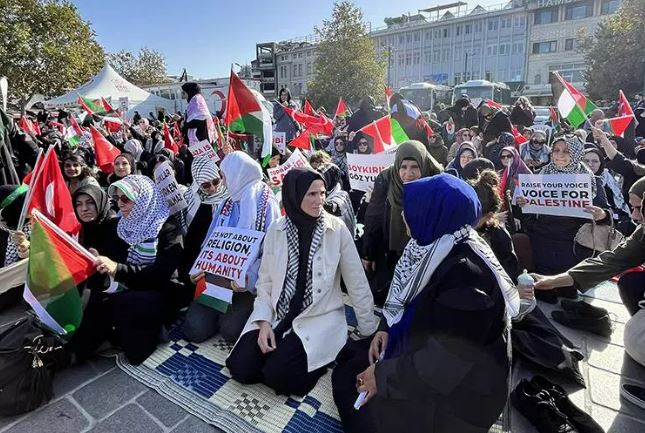 İstanbul'da sivil toplum örgütlerinin kadın temsilcileri ve anneler, Eminönü'nde bir araya gelerek Filistin'de İsrail'in uyguladığı soykırıma tepki olarak oturma eylemi başlattı. Kadınlara destek veren KADEM Mütevelli Heyeti Başkanı Sümeyye Erdoğan Bayraktar, " Tüm insanlığı da bu trajediye karşı seslerini yükseltmeye çağırıyoruz" dedi.
