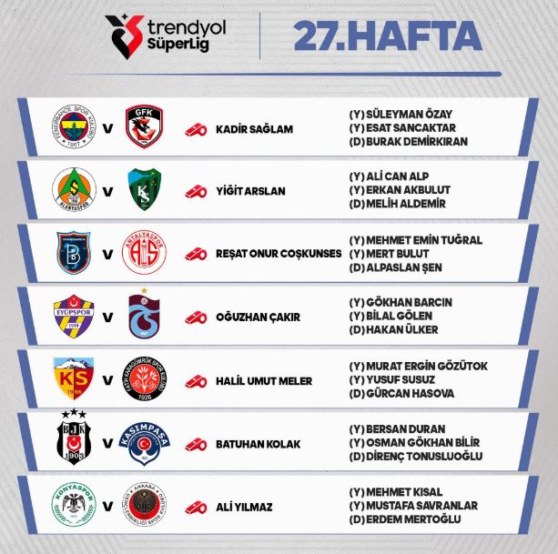 Süper Lig’de 27. Hafta Hakemleri Açıklandı.. Trendyol Süper Lig’de 27. hafta karşılaşmalarında görev yapacak hakemler belli oldu.