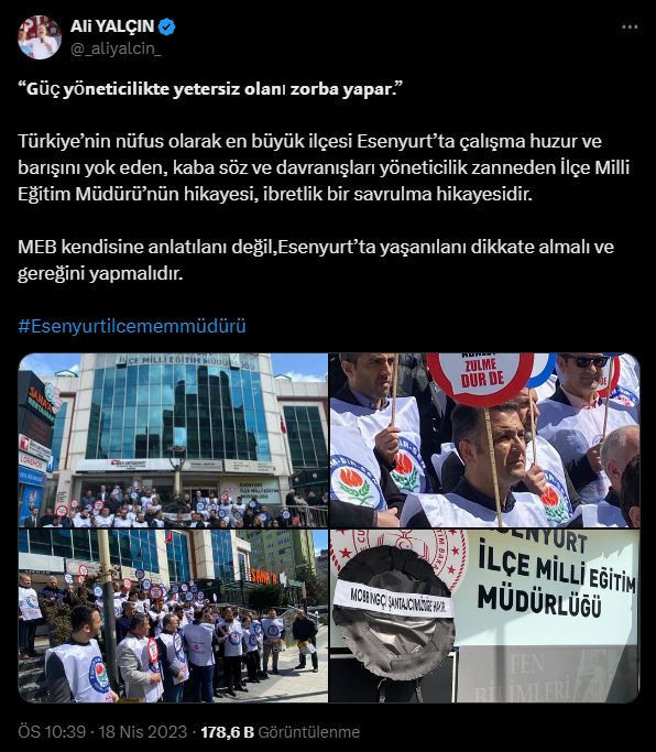 “𝗚üç 𝘆ö𝗻𝗲𝘁𝗶𝗰𝗶𝗹𝗶𝗸𝘁𝗲 𝘆𝗲𝘁𝗲𝗿𝘀𝗶𝘇 𝗼𝗹𝗮𝗻ı 𝘇𝗼𝗿𝗯𝗮 𝘆𝗮𝗽𝗮𝗿.” Türkiye’nin nüfus olarak en büyük ilçesi Esenyurt’ta çalışma huzur ve barışını yok eden, kaba söz ve davranışları yöneticilik zanneden İlçe Milli Eğitim Müdürü’nün hikayesi, ibretlik bir savrulma hikayesidir. MEB kendisine anlatılanı değil,Esenyurt’ta yaşanılanı dikkate almalı ve gereğini yapmalıdır.