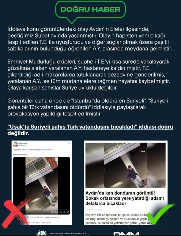 Cumhurbaşkanlığı İletişim Başkanlığı Dezenformasyonla Mücadele Merkezi sosyal medyada paylaşılan görüntüler üzerine “Uşak’ta Suriyeliler Türk vatandaşını bıçakladı” iddialarının gerçek olmadığını açıkladı. Olayın geçtiğimiz şubat ayında Aydın’ın Efeler ilçesinde meydana geldiği ve olayda ismi geçen şahısların Türk vatandaşı olduğu belirtildi.