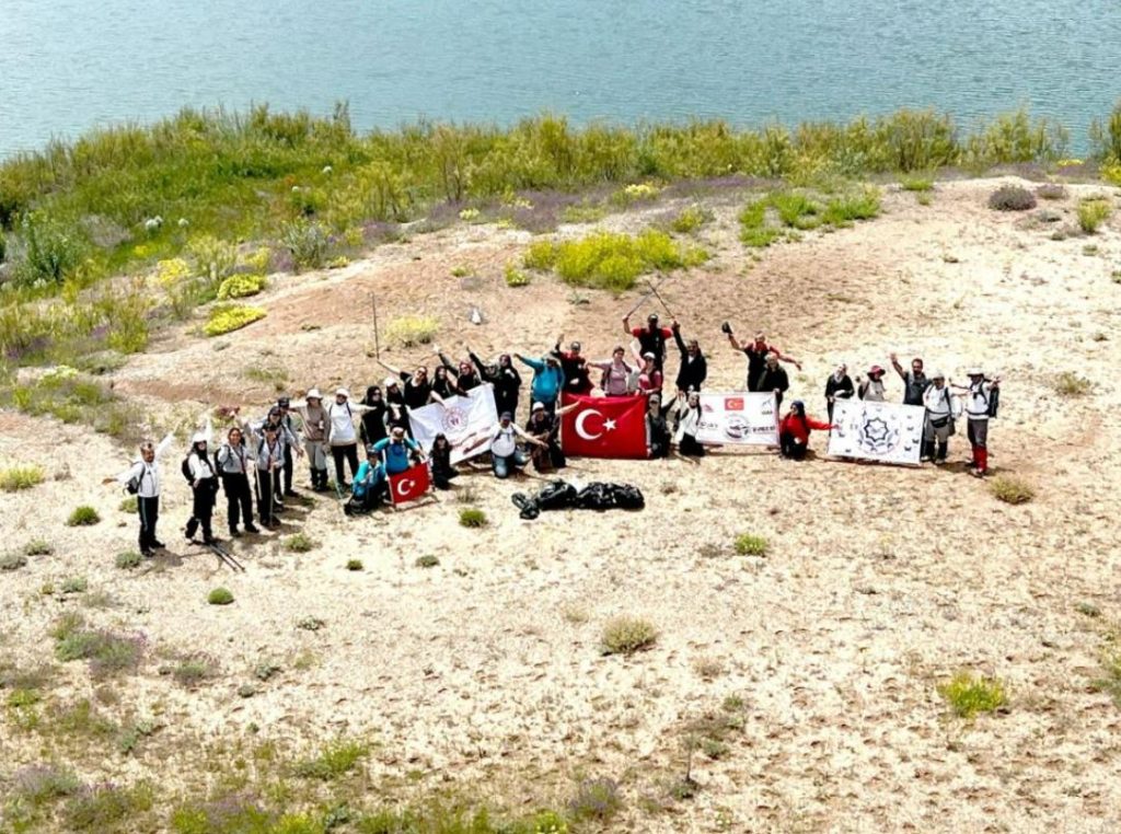 Eğitim çalışanları, su ve su kaynaklarının önemine dikkat çekmek ve farkındalık oluşturmak için gerçekleştirdikleri doğa yürüyüşü programı kapsamında izcilerle birlikte baraj havzasında çevre temizliği de yaptı. (İHA)