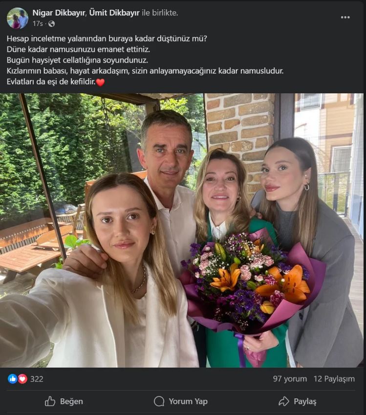 Taciz iddialarını ardından eşi ve çocuklarıyla fotoğrafını paylaşan Nigar Dikbayır, "Hesap inceletme yalanından buraya kadar düştünüz mü? Düne kadar namusunuzu emanet ettiniz. Bugün haysiyet cellatlığına soyundunuz. Kızlarımın babası, hayat arkadaşım, sizin anlayamayacağınız kadar namusludur. Evlatları da eşi de kefildir" diye yazdı. (Haber Merkezi)
