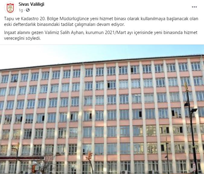 Sivas Valiliği'nin sosyal medya hesabı facebookta yayınladığı istasyon caddesinde tadilatı devam eden eski vergi dairesi binası ile ilgili 100 ün üzerinde vatandaştan yorum geldi.
