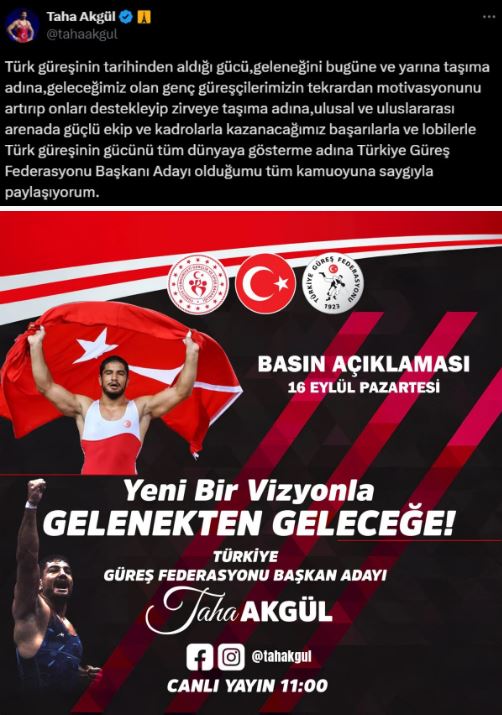 Geçtiğimiz haftalarda sporculuk kariyerini noktalayan Taha Akgül, Türkiye Güreş Federasyonu başkanlığına aday olduğunu açıkladı.