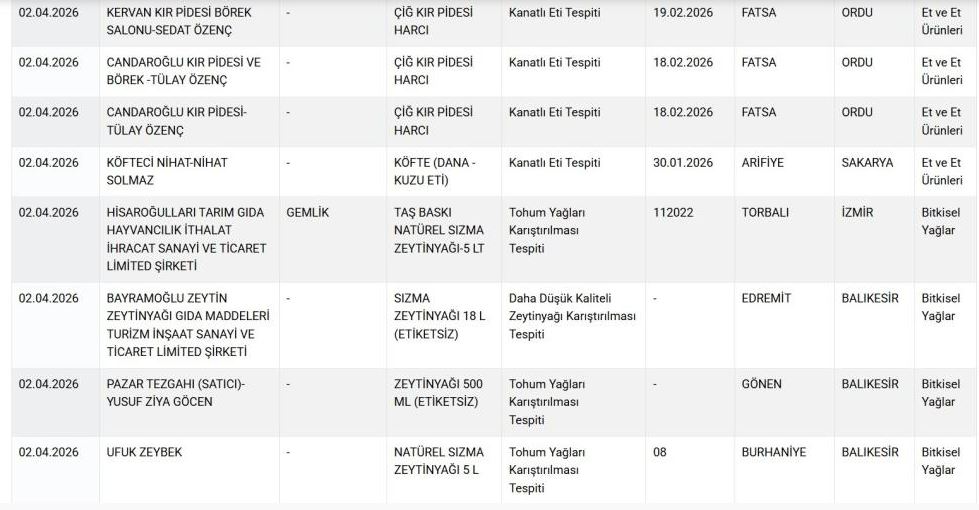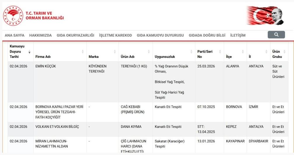 Tarım ve Orman Bakanlığı, vatandaşların sağlıklı ve güvenilir gıdaya ulaşabilmesi amacıyla bu tür denetimlerin düzenli olarak sürdürüldüğünü belirtirken, güncel listelerin kamuoyuyla paylaşılmaya devam edileceğini bildirdi.