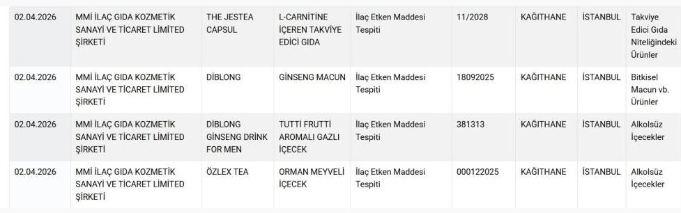 Güncellenen listede özellikle “Sağlığı Tehlikeye Düşürecek Gıdalar” başlığı altında dikkat çeken bulgular yer aldı. İstanbul Kağıthane merkezli bir firmaya ait bitkisel ve takviye edici gıda olarak pazarlanan bazı ürünlerde ilaç etken maddesi tespit edildiği açıklandı.