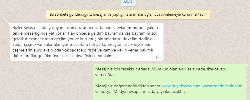 Vatandaş mesajında "Bizler Sivas dışında yaşayan insanlarız annemiz babamız evladım burada yukarı tekke mezarlığında yatıyorlar 1 ay öncede geldim bayramda yas bayramımız dı geldik mezarlar otdan geçilmiyor ve kurumuş bidonlarla su dökelim dedik o kadar çeşme var sular akmıyor mezarlara fıskıye konmuş onlar akmıyor bari çeşmelerin suyu aksın oda yok sadece girişte ve camiye yakın yerler bakımlı diğer taraflar gözükmüyor nasılsa diye öylece bırakılmış" derken bir diğer vatandaş ise mesajında "Sami Aydın başkanlığında başlatılan yukarı tekke yenilemesi düzenlemesi ne hikmetse yıllardır, bizzat sami aydin'in sıra buraya da gelecek dediği yerlere gelmedi gelmiyor. idari binasının cenaze yıkama girişinin karşısındaki adadır burası... Unutulduk mu acaba?" dedi.