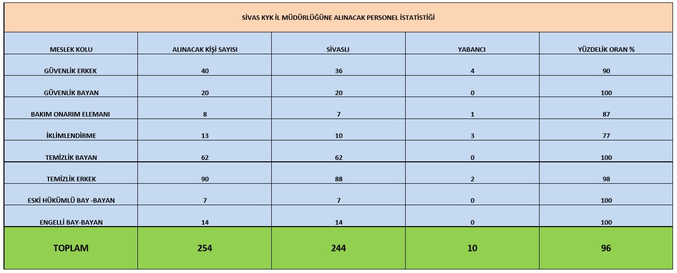 Personel olarak alınan Güvenlik Erkek, Güvenlik Bayan, Bakım Onarım Elemanı, İklimlendirme, Temizlik Bayan, Temizlik Erkek, Eski Hükümlü Bay -Bayan, Engelli Bay-Bayan arasında 254 kişide sadece 10 kişi Sivaslı olmazken geriye kalan 244 kişinin ise Sivaslı olması sevinç oluşturdu.
