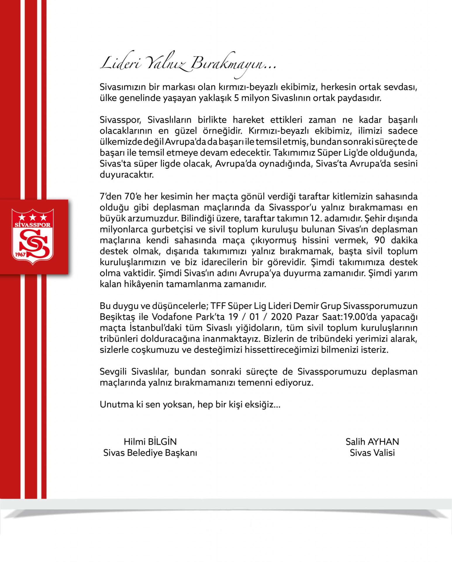 Vali Ayhan'ın ve Başkan Bilgin'in ortak bildirisinde Sivasspor taraftarını ve sivil toplum kuruluşlarını Beşiktaş maçına çağırdı.