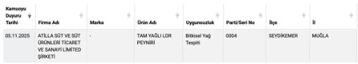 Bakanlık tarafından yayımlanan güncel taklit ve tağşiş listesinde, Atilla Süt ve Süt Ürünleri Ticaret ve Sanayi Ltd. Şti. adlı firmaya ait “Tam Yağlı Lor Peyniri” ürününde bitkisel yağ tespit edildi.