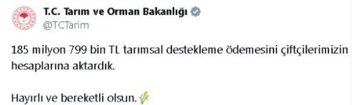 Tarım ve Orman Bakanlığı, 185 milyon 799 bin lira tarımsal destekleme ödemesinin çiftçilerin hesaplarına yatırıldığını açıkladı.