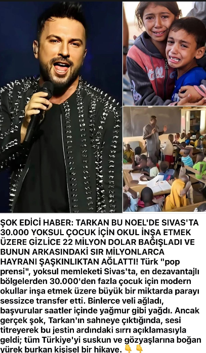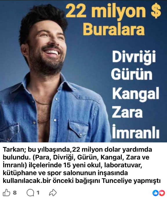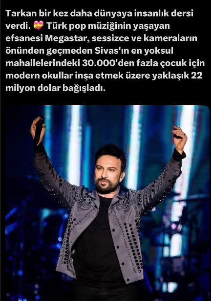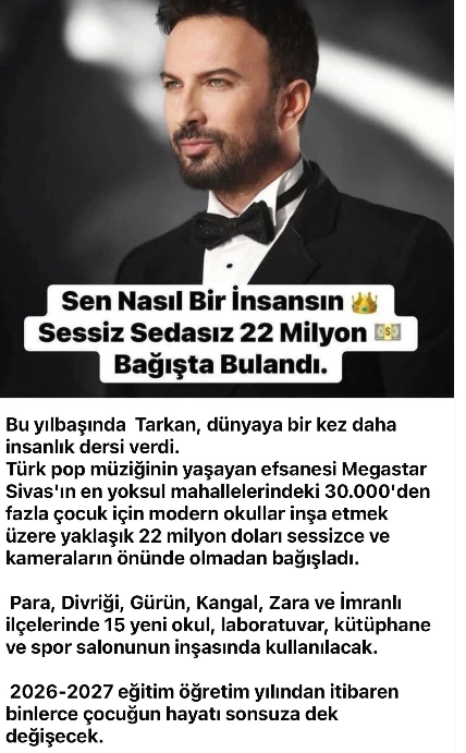 Tarkan Sivas'a 22 Milyon Dolar Verdi mi? Sosyal medyada son günlerde hızla yayılan asılsız iddialara bir yenisi daha eklendi. Popstar Tarkan’ın Sivas’a 22 milyon dolar bağış yaptığı ve bu parayla bazı ilçelerde okul inşa edileceği yönündeki paylaşımların gerçeği yansıtmadığı ortaya çıktı.