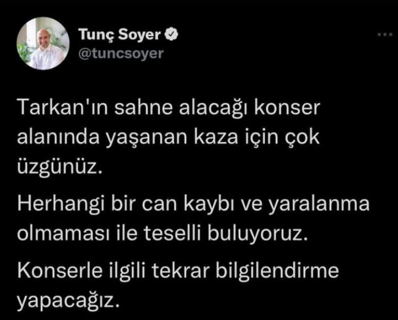 Yıkılan platform hakkında sosyal medya üzerinden açıklama yapan İzmir Büyükşehir Belediye Başkanı Tunç Soyer, “Tarkan’ın sahne alacağı konser alanında yaşanan kaza için çok üzgünüz. Herhangi bir can kaybı ve yaralanma olmaması ile teselli buluyoruz. Konserle ilgili tekrar bilgilendirme yapacağız” açıklamasında bulundu.