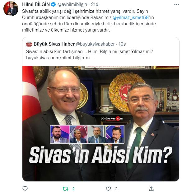Bilgin yayınladığı mesajında şu ifadelere yer verdi; "Sivas’ta abilik yarışı değil şehrimize hizmet yarışı vardır. Sayın Cumhurbaşkanımızın liderliğinde Bakanımız @yilmaz_ismet58’ın öncülüğünde şehrin tüm dinamikleriyle birlik beraberlik içerisinde milletimize ve ülkemize hizmet yarışı vardır."