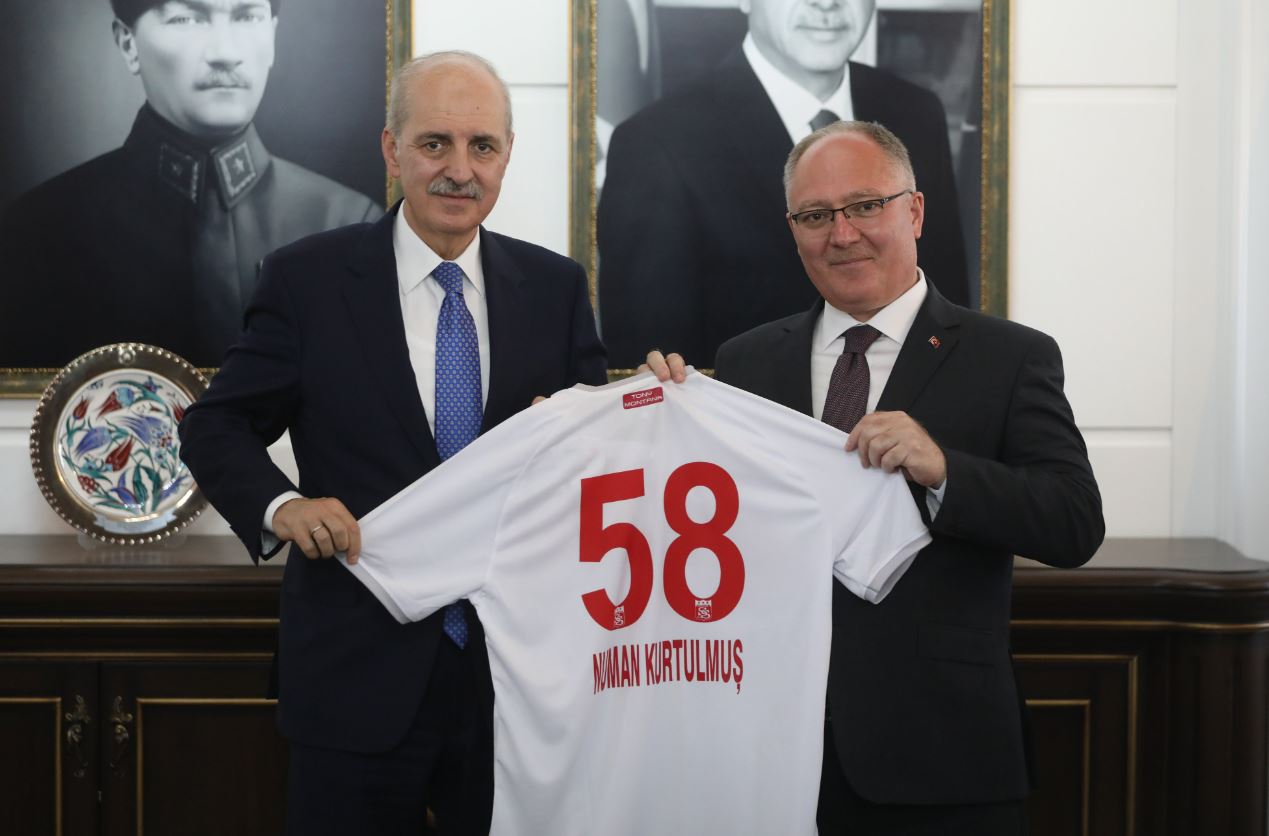 Ziyaretten duyduğu memnuniyeti ifade eden Başkan Bilgin ise günün anısına Kurtulmuş'a Sivasspor forması ile hat yazılı tablo hediye etti.