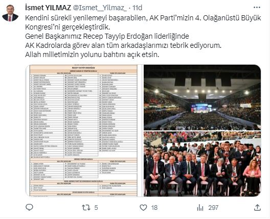 Yılmaz paylaşımında "Kendini sürekli yenilemeyi başarabilen, AK Parti’mizin 4. Olağanüstü Büyük Kongresi’ni gerçekleştirdik. Genel Başkanımız Recep Tayyip Erdoğan liderliğinde AK Kadrolarda görev alan tüm arkadaşlarımızı tebrik ediyorum. Allah milletimizin yolunu bahtını açık etsin." ifadelerine yer verirken kongrenin hayırlı olmasını diledi.