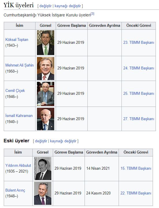 TBMM eski başkanlarından oluşan mevcut kurul üyeleri Cemil Çiçek, İsmail Kahraman, Köksal Toptan, Mehmet Ali Şahin'e ek olarak Binali Yıldırım, Mustafa Şentop ve İsmet Yılmaz'ında yer alacağı listede YİK üyeleri ile Başkan Erdoğan dönem dönem toplantılar yapacak...