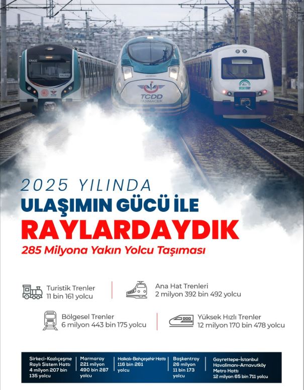 Verilere göre 2025 yılı içerisinde ana hat trenleri 2 milyon 392 bin 492 yolcuya hizmet verirken, bölgesel trenlerde 6 milyon 443 bin 175 yolcu taşındı. Yüksek hızlı trenler ise 12 milyon 170 bin 478 yolcuyu gidecekleri noktalara ulaştırarak yoğun ilgi görmeye devam etti. Turistik tren seferleri de 11 bin 161 yolcu ile demiryolu turizmine katkı sağladı.