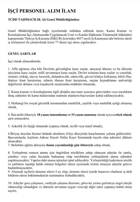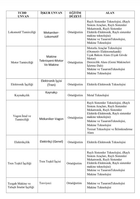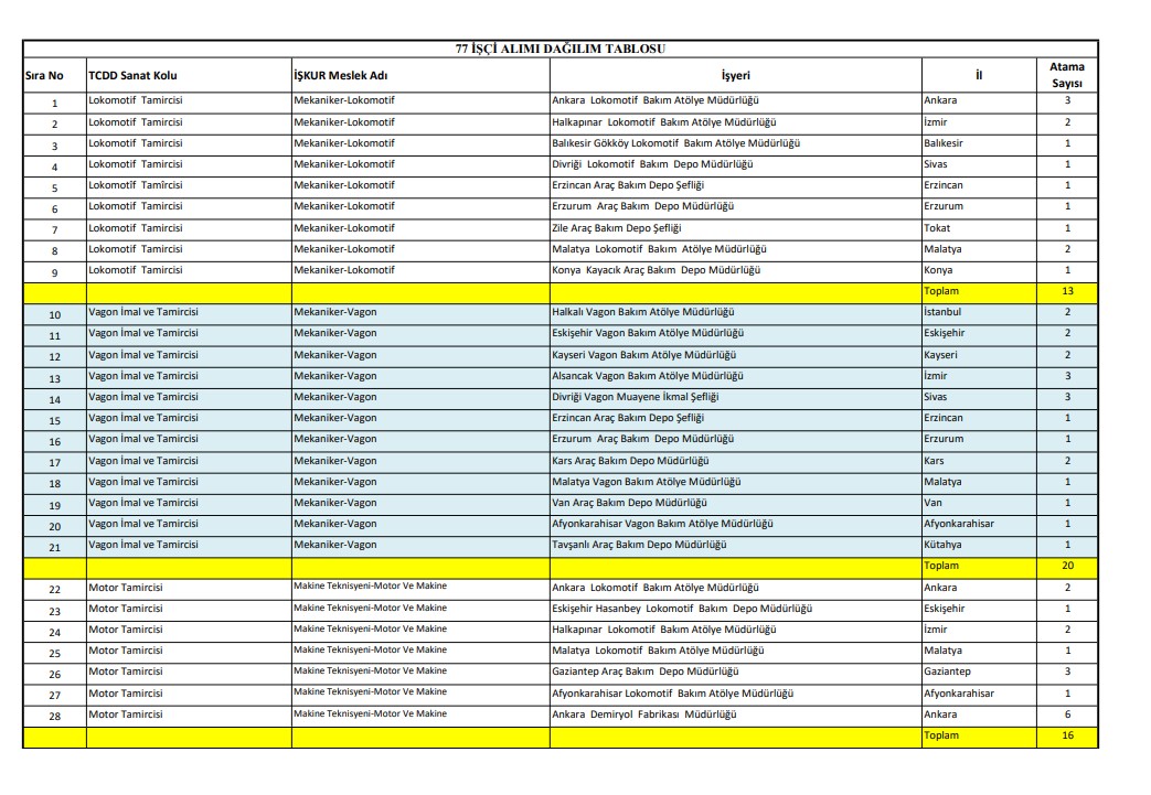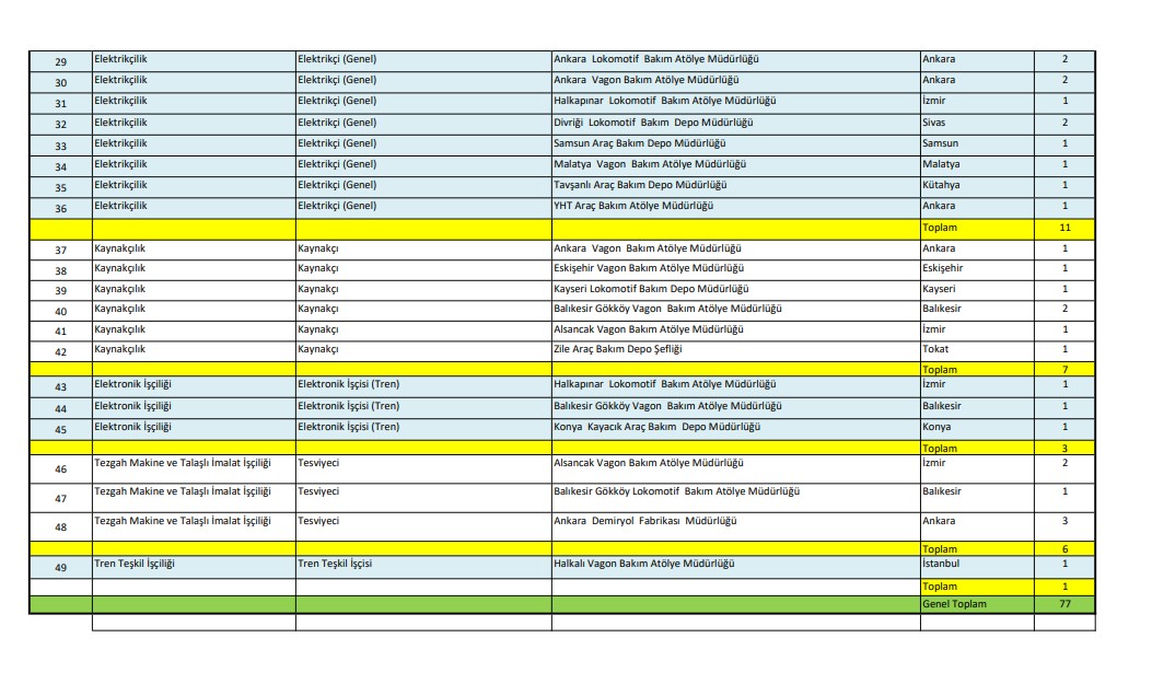 TCDD Taşımacılık AŞ Genel Müdürlüğü tarafından yapılan duyuruya göre, Türkiye İş Kurumu (İŞKUR) üzerinden 77 daimi işçi alınacak. Raylı sistemlerin merkez üslerinden biri konumunda bulunan Sivas, alım yapılacak şehirler arasında dikkat çeken illerden biri oldu.