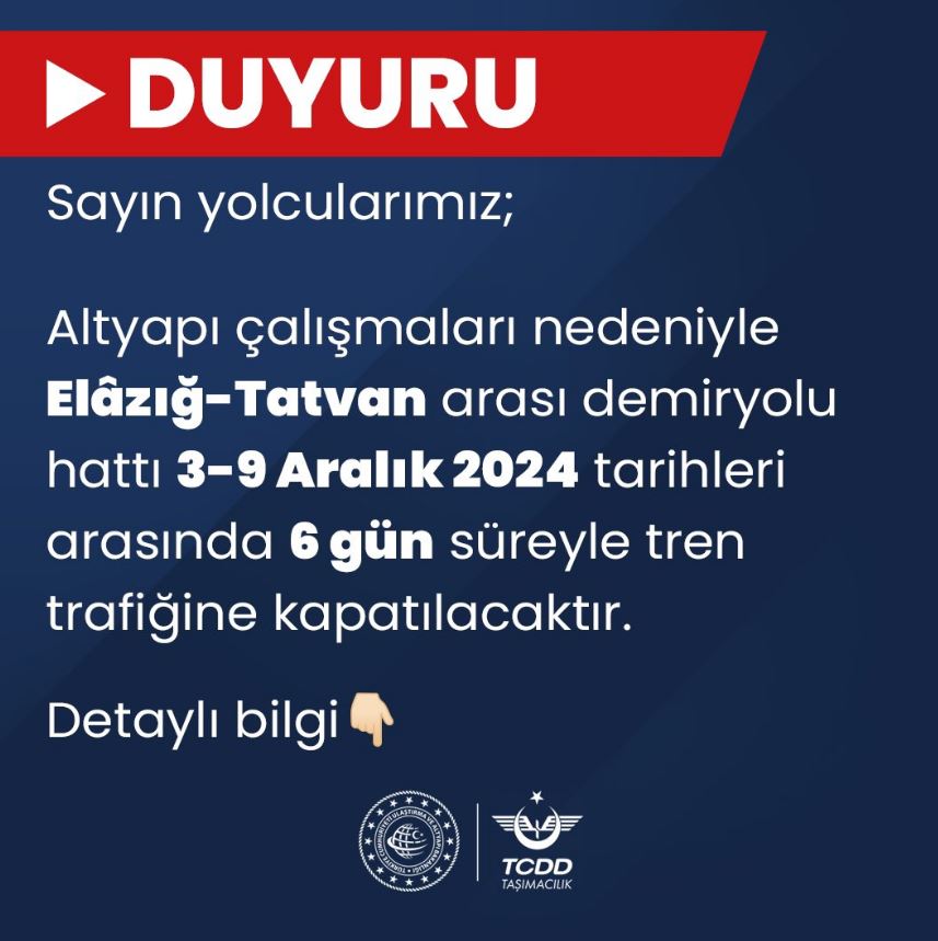 📍 Elâzığ-Tatvan arasında işleyen Tatvan’dan 4 ve 7 Aralık, Elazığ’dan 3 ve 6 Aralık tarihlerinde çalıştırılan 4 bölgesel tren seferi işlemeyecektir." ifadelerine yer verildi.