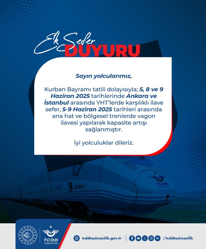 Ayrıca, 5-9 Haziran 2025 tarihleri arasında ana hat ve bölgesel trenlerde vagon ilavesi yapılarak yolcu kapasitesi artırılacak. Kapasite artırımı kapsamında İzmir Mavi, Doğu, Güney, Van Gölü, Ege, Erciyes, Pamukkale, Ankara, Konya Mavi, 6 Eylül ve 17 Eylül Ekspresleri ile Uzunköprü-Halkalı ve Edirne-Halkalı bölgesel trenlerine ilave vagonlar eklenecek.