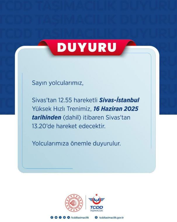 TCDD tarafından yapılan açıklamaya göre, halihazırda Sivas’tan saat 12.55’te hareket eden Sivas-İstanbul Yüksek Hızlı Treni, 16 Haziran 2025 tarihinden itibaren Sivas’tan 13.20’de hareket edecek.