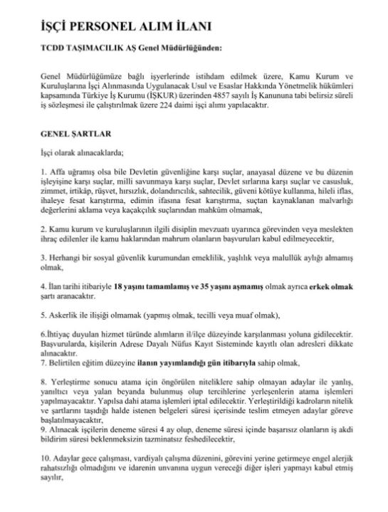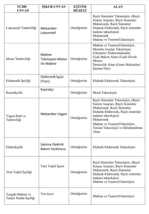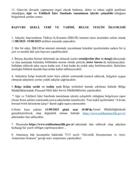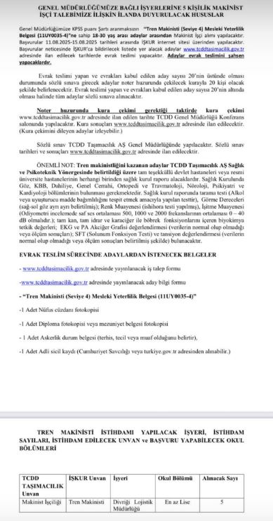 Başvurularla ilgili detaylar ve istenilen belgeler TCDD Taşımacılık AŞ’nin resmi internet sitesinden öğrenilebilecek.