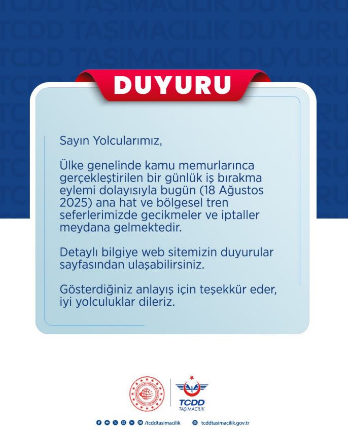 Ülke genelinde kamu memurlarının gerçekleştirdiği bir günlük iş bırakma eylemi nedeniyle TCDD’den yolculara önemli bir duyuru yapıldı.