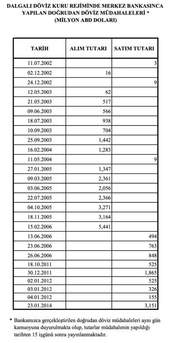 Merkez Bankası, piyasaya resmi olarak son müdahalesini, Erdem Başçı döneminde 23 Ocak 2014 tarihinde 3 milyar 151 milyon dolarlık döviz satım ihalesi yaparak gerçekleştirmişti. Son ihale İle satış ise 24 Nisan 2016 tarihindeydi. habertürk
