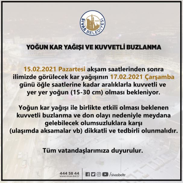 Sivas Belediyesi yoğun kar yağışı ve kuvvetli buzlanma hususunda uyarıda bulundu.