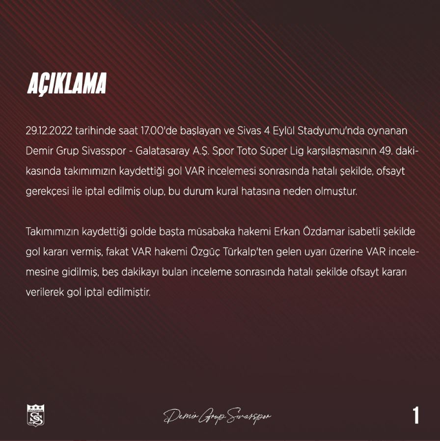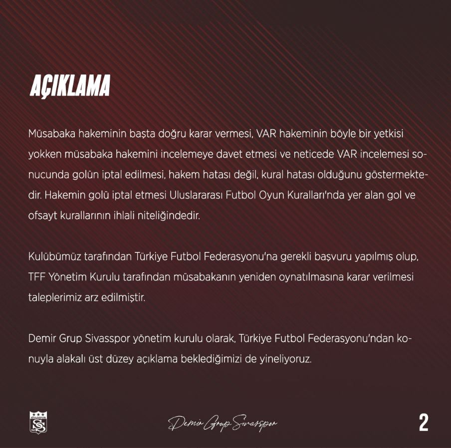 DG Sivasspor, kural hatası nedeniyle Galatasaray maçının tekrar edilmesi için Türkiye Futbol Federasyonu'na (TFF) başvuru yapıldığını açıkladı.
