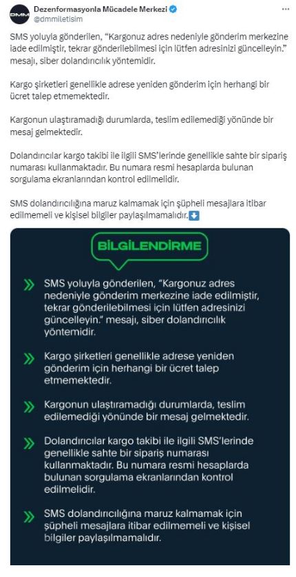 Cumhurbaşkanlığı İletişim Başkanlığı Dezenformasyonla Mücadele Merkezi cep telefonlarına gelen "“Kargonuz adres nedeniyle gönderim merkezine iade edilmiştir, tekrar gönderilebilmesi için lütfen adresinizi güncelleyin.” mesajıyla ilgili vatandaşları uyardı.