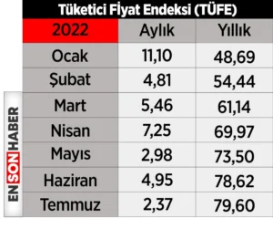 TÜİK, temmuz ayı enflasyon verilerini paylaştı. Buna göre, temmuz ayı enflasyonu yıllık yüzde 79,60, aylık yüzde 2,37 olarak açıklandı.