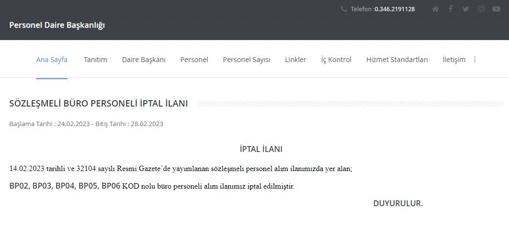 Yayınlanan duyuru da "İPTAL İLANI! 14.02.2023 tarihli ve 32104 sayılı Resmi Gazete’de yayımlanan sözleşmeli personel alım ilanımızda yer alan; BP02, BP03, BP04, BP05, BP06 KOD nolu büro personeli alım ilanımız iptal edilmiştir." ifadelerine yer verildi.