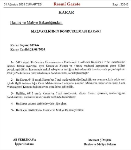 Resmi Gazete'de yayımlanan karara göre, PKK/KCK terör örgütü ile bağlantılı 14 kişi ve 5 kuruluşun, MKP Terör Örgütü ile ilişkilendirilen 5 kişinin, ve FETÖ/PDY terör örgütü ile bağlantılı 20 kişinin mal varlıkları donduruldu.