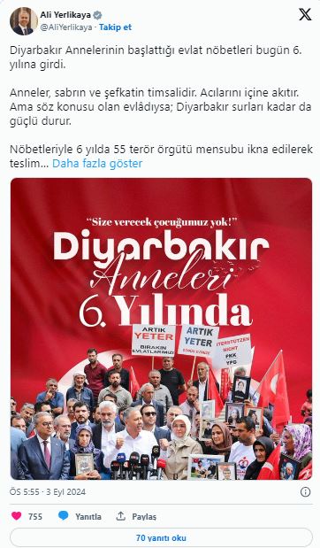 İçişleri Bakanı Ali Yerlikaya, X (eski adıyla Twitter) hesabından yaptığı paylaşımda, Diyarbakır Anneleri'nin başlattığı evlat nöbetlerinin 6. yılına girdiğini belirtti.