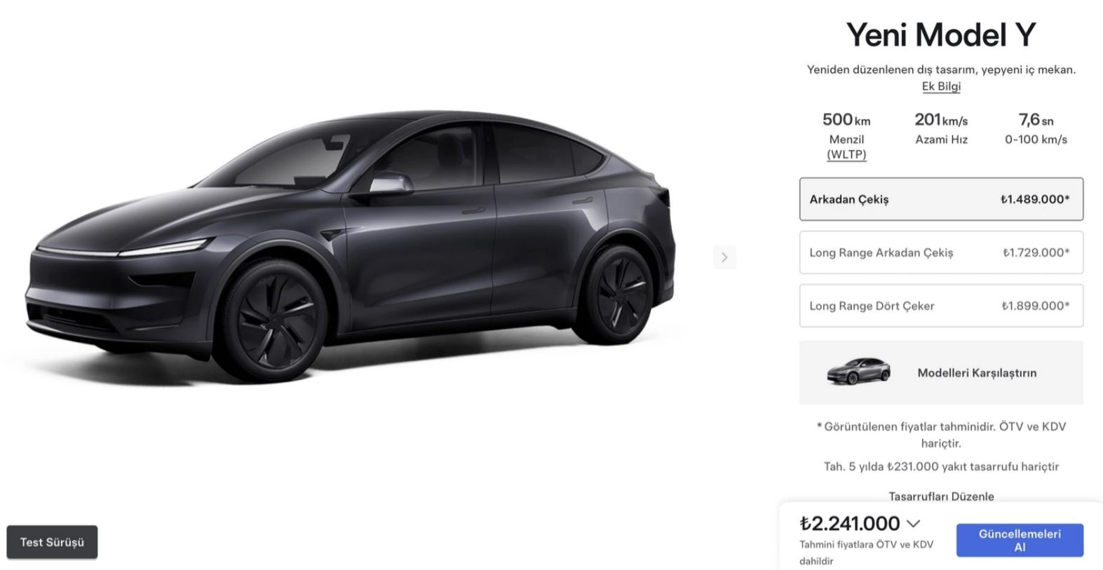 - Model Y LR AWD: 3.998.400 – 4.074.420 TL
