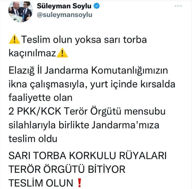 İçişleri Bakanı Süleyman Soylu ayrıca, "Teslim olun yoksa sarı torba kaçınılmaz" ifadelerini kullandı. iha