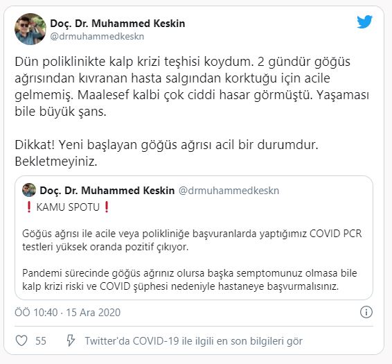 Uzmanlar uyardı: Göğüs ağrısı şikayeti olanların birçoğunun testi pozitif çıkıyor. Dünyayı etkisi altına alan koronavirüs salgınının belirtilerinden biri olan göğüs ağrısı son dönemde çok dikkat çekmeye başladı. Doç. Dr. Muhammed Keskin, göğüs ağrısı şikayeti ile hastaneye başvuran kişilerin çoğunun kovid-19 testinin pozitif çıktığını belirtti.
