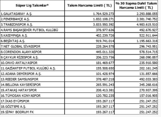 Yapılan açıklamaya göre Süper Lig'de ara transfer döneminde takımların harcama limitleri şöyle: